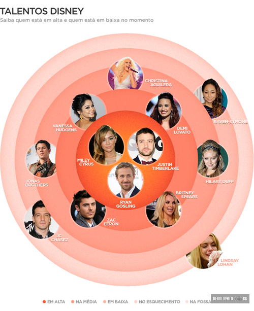 DEMI LOVATO - Depois de uma passagem ainda quando criança pelo programa “Barney e Seus Amigos”, Demi ficou famosa no “Camp Rock” ao lado dos Jonas Brothers, em 2008. Na Disney, ela teve também seu próprio programa, o “Sunny Entre Estrelas”, que acabou em 2011. Agora ela virou cantora pop e lançou até um CD com produção de Missy Elliott e Timbaland.